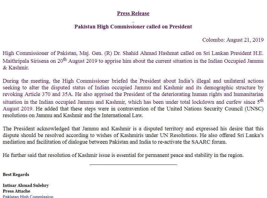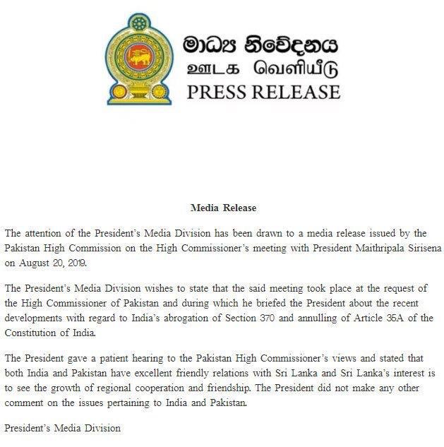 By specifically referring to the press release by the Pakistani High Commissioner, the Sri Lankan press release says clearly that none of what the Pakistani High Commissioner imagined EVER happened!! He said EXACTLY what India has said and the President did not make ANY other statement!