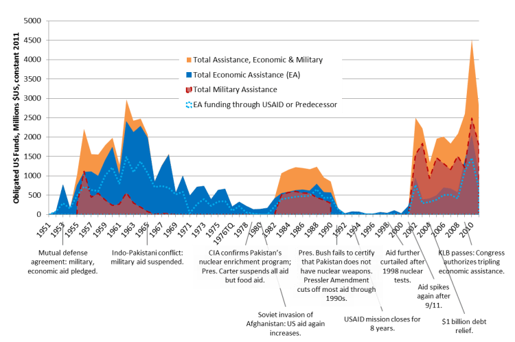 Right after India’s independence and Pakistan’s formation, US promised Pakistan a total aid of $67 billion (in constant 2011 dollars) between 1951 and 2011 ($78.3 billion between 1948 and 2016). Although the level of aid on yearly basis has gone up and down, but the aid has always been provided to Pakistan. Here is the historical picture from 1951 to the present. After the nuclear tests, the aid was the least but was still there.