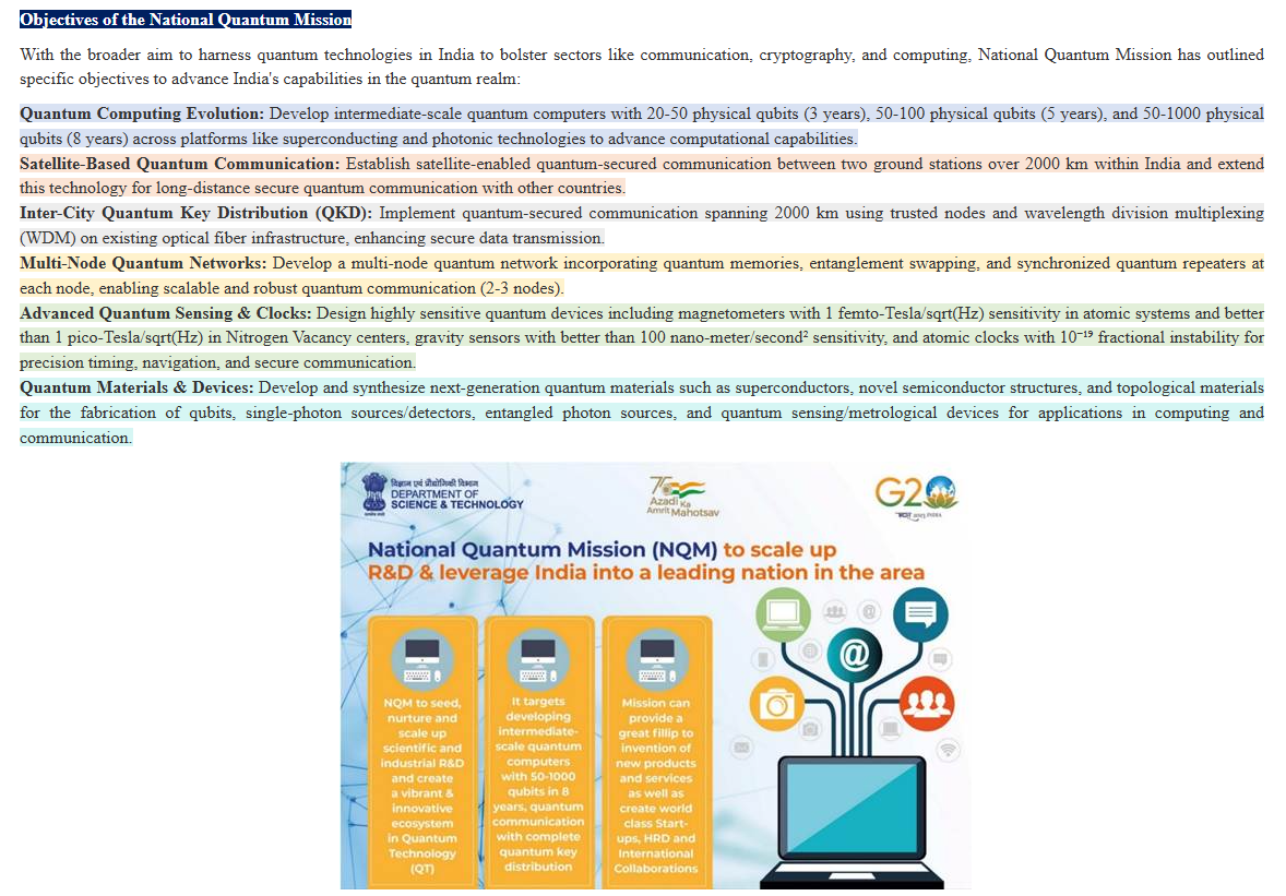 - Quantum Communication: Establishment of satellite-based secure quantum communication links with a range of 2000 km within India and with other countries, development of inter-city QKD networks spanning 2000 km, and creation of multi-node quantum networks incorporating quantum memories.