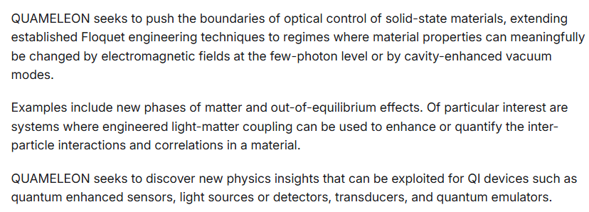 Research Focus: DARPA's QUAMELEON (QUAntum Materials Engineering using eLectrOmagNetic fields) program aims to push the boundaries of optical control of solid-state materials, seeking to change material properties using electromagnetic fields at the few-photon level or by harnessing cavity-enhanced vacuum modes. Research in this field is also driven by nanoscale techniques such as atomic-scale imaging and spectroscopy, single-spin quantum sensing for material characterization, and "twist engineering" (e.g., in Moiré superlattices) to create novel quantum phases.