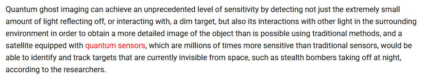 - Ghost Imaging: This technique allows for the visualization of objects through scattering media like fog, smoke, or even thin walls by using correlations between two light beams, only one of which interacts with the object. China has reportedly been developing ghost imaging satellites with the aim of detecting stealth aircraft and other concealed targets.