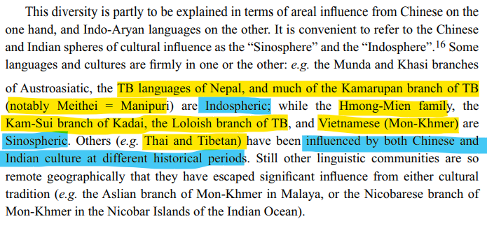 In the Indospheric sphere, which is heavily influenced by Indian culture and languages, we find the Munda and Khasi branches of the Austroasiatic language family. Additionally, several languages within the Tibeto-Burman family, particularly those spoken in Eastern Nepal, align with this sphere. A notable subset of the Tibeto-Burman family is the "Kamarupan" group, which prominently includes Meitei (Manipuri), a language with deep historical and cultural roots in the Indian subcontinent.