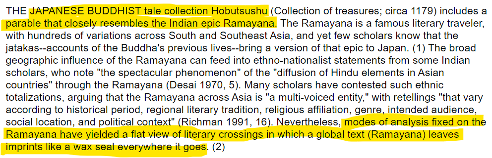 The Hobutsushu text integrates the story of Rama (from "Ramayana") into a Buddhist framework. The narrative often emphasizes Buddhist virtues and teachings, transforming the original Hindu epic into a vehicle for Buddhist moral and spiritual lessons. "Hobutsushu" reflects the syncretic nature of Japanese religious culture, where Buddhist, Shinto and other indigenous religious elements often merge. The adaptation of a Hindu epic into a Buddhist text is an example of this cultural and religious synthesis.