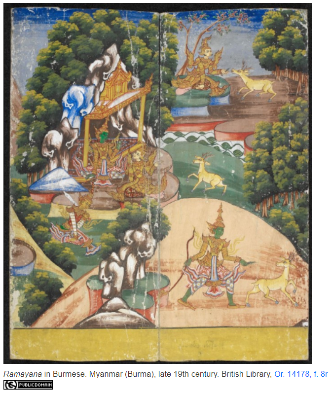 The great Indian epic Ramayana is known in Burmese as Yama Zatdaw. This beautiful illustrated folding book depicts the episode when Rama (with green face), his wife Sita and and his brother Lakshmana are living in exile. The demon king Ravana plots to abduct Sita by sending one of his demons in the form of a golden deer. Sita begs Rama to catch the golden deer for her (left), and so he leaves Sita under the protection of Lakshmana and goes off to shoot the golden deer with his bow and arrow. (Source: Literary manuscripts from Southeast Asia on display / British Library)