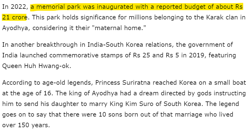 In 2022, a park was built on the bank of the Sarayu River in Ayodhya to commemorate this link. While the southeast corner of the memorial has a statue of Queen Huh Hwang-ok, the northeast corner has a statue of King Kim Suro. Princess Suriratna's sea journey has been recreated at the memorial with the help of a pond and footbridge (Source: Why an Indian Princess's memorial in Ayodhya is a big draw for South Korean tourists / India Today).