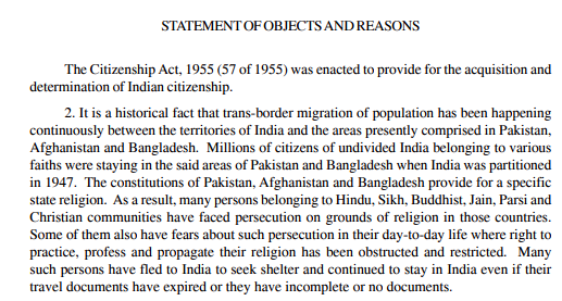 Objects and Reasons of the Citizenship Amendment Act
