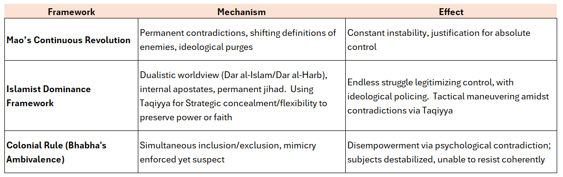 Taqiyya allows believers to conceal their beliefs or intentions when facing persecution or danger. Similarly, Mao’s flexible handling of contradictions functioned as a political survival strategy, enabling the regime to navigate crises, suppress dissent, and neutralize opposition by shifting ideological boundaries.