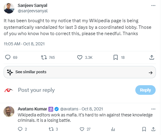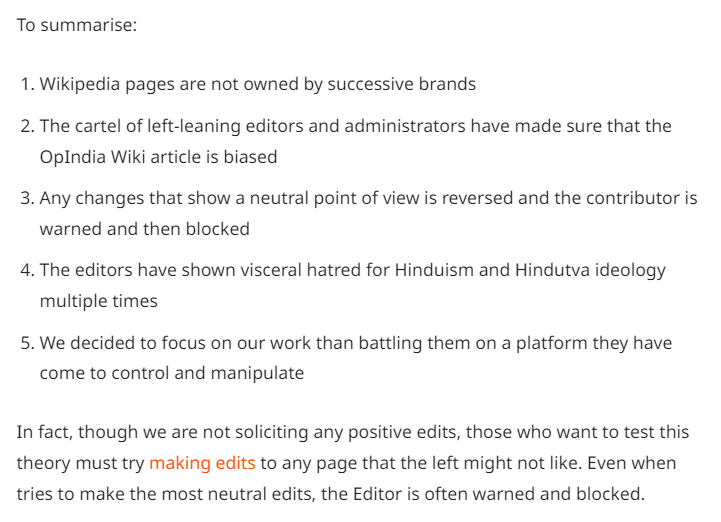 Wikipedia pages, for example, of Sanjeev Sanyal, Sadhguru, and Opindia have been subverted (I don't call it vandalized because this exercise has a certain intention and objective to it) by certain editors.
