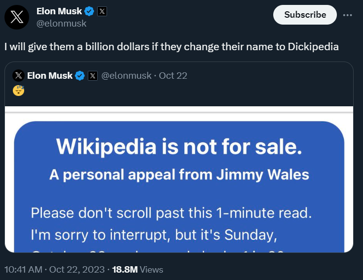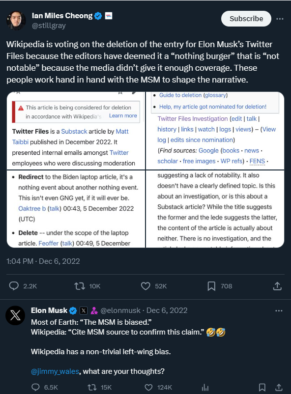 Of course, Elon Musk weighs in on the situation at Wikipedia as well. He first discussed the "non-trivial" left-wing bias of Wikipedia.
