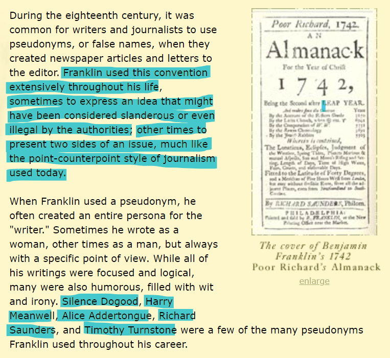 He did not always use that name, however. Without others knowing it of course. He went by at least 5 pseudonyms - Silence Dogood, Harry Meanwell, Alice Addertongue, Richard Saunders, and Timothy Turnstone.
