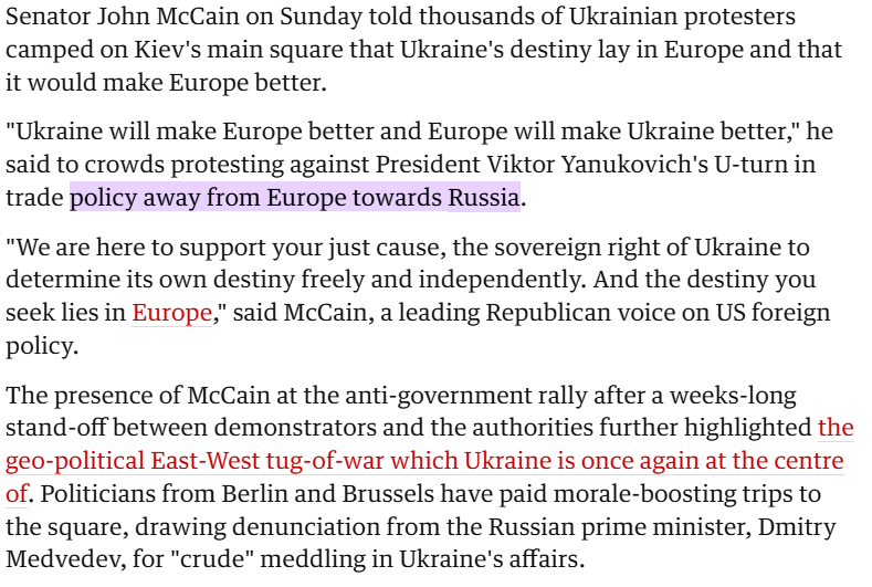 When Yanukovych (then President) ditched an EU trade deal in favor of Russian aid, student-led protests in Kyiv’s Maidan Square swelled into a revolution after a violent crackdown. Western governments not only cheered from the sidelines, but their officials also directly intervened in the process. U.S. Senator John McCain flew to “We are here to support your just cause… Ukraine’s destiny lies in Europe”.