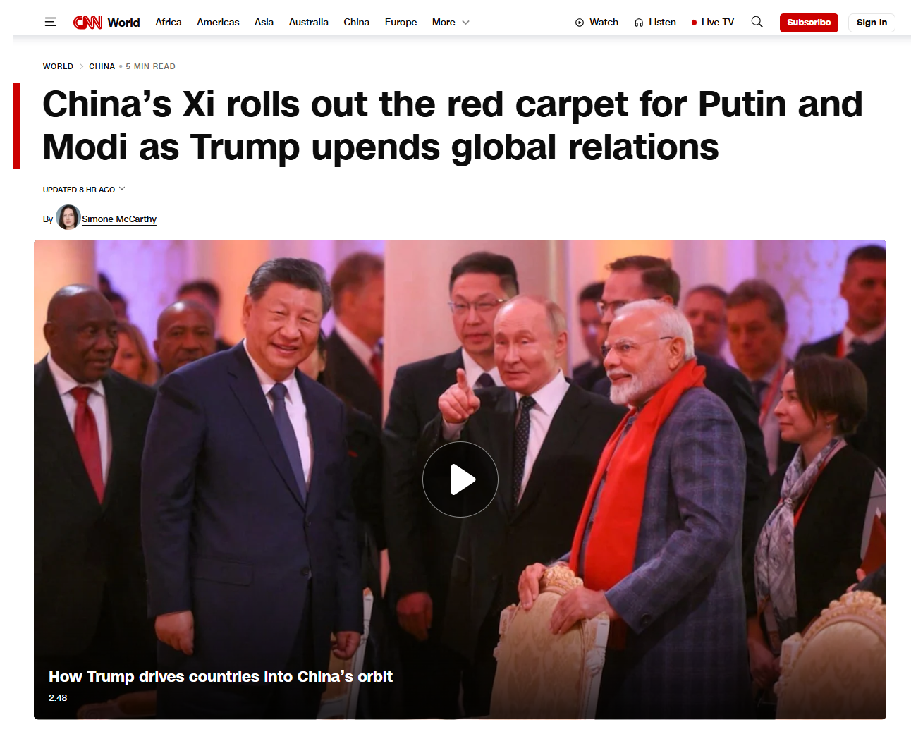 “Beijing wants to signal that China is the indispensable convener in Eurasia, capable of seating rivals at the same table and translating great-power competition into managed interdependence,” said Rabia Akhtar, director of the Centre for Security, Strategy and Policy Research at the University of Lahore in Pakistan. “The optics are straightforward: China is not just a participant in regional order-making – it is a primary architect and host.” Modi’s attendance at the gathering also adds heft to Xi’s guest list. The Indian prime minister skipped last year’s summit in Kazakhstan. Now, he has arrived in Tianjin against a backdrop of souring relations with Washington – and as Beijing and New Delhi have moved to ease their own frictions, a nascent realignment that could imperil US efforts to cultivate India as a counterweight against a rising China. (Source: "China’s Xi rolls out the red carpet for Putin and Modi as Trump upends global relations" / CNN)