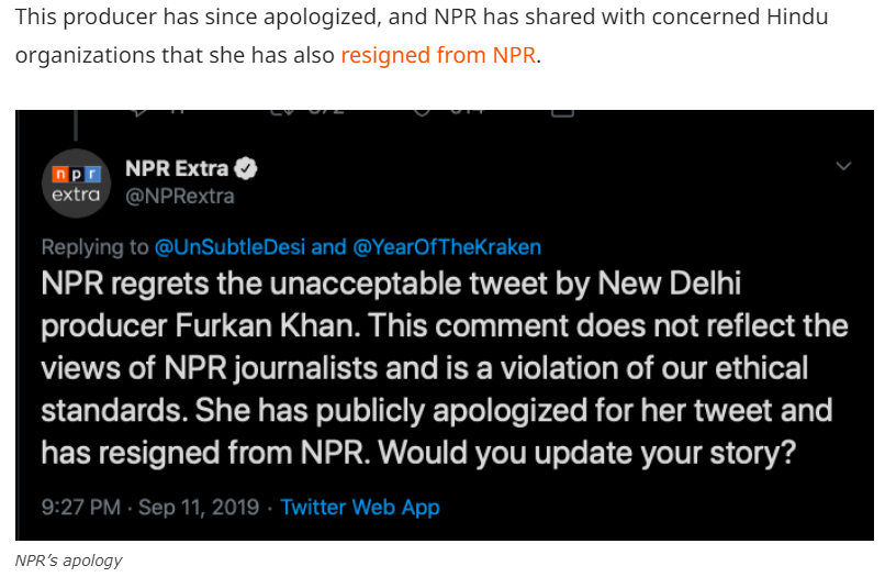 NPR's response - at least overtly on Furkan's tweet - was that the NPR producer had apologized and "resigned from NPR".