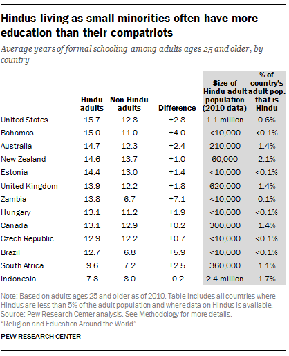 The education levels also parallel this income-earning capacity very well. Hindus are significantly better educated than Non-Hindus in their host countries.