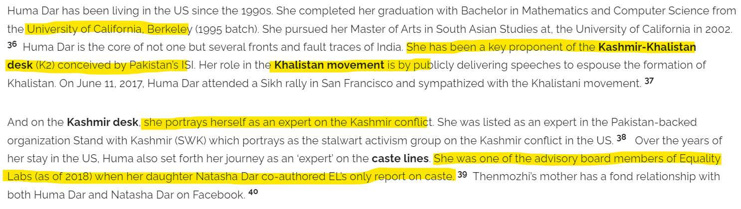 As per a detailed report by the Disinfo Lab, Huma Dar has been a long-standing Kashmir-Khalistan desk (K2) of the ISI. Her daughter, Natasha Dar, was the co-author of Equality Labs 2018 Annual caste report.