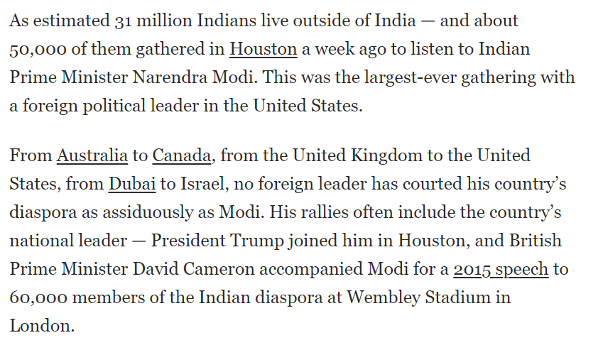 - Diaspora: Prior to Modi's events, no one even realized the political strength or the numbers of the Indian community. That they are aligned so strongly with a political spectrum in their origin country and have strong political minds was apparent. Suddenly, the political parties realized that Indians are a good political group to align with. One has seen the engagement of the political candidates with the Indian community in general and the Hindu community in particular increase post-Modi events.