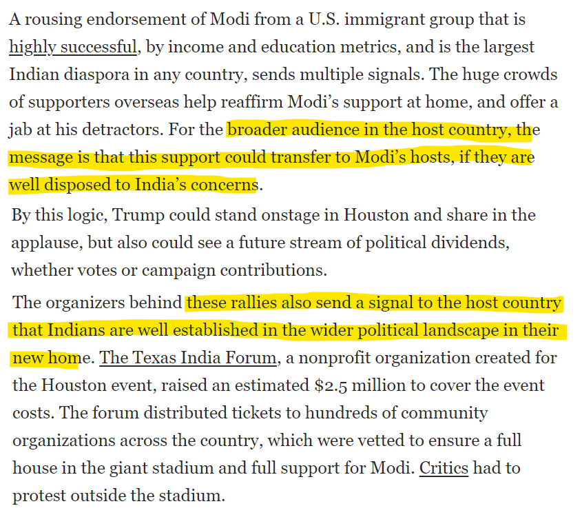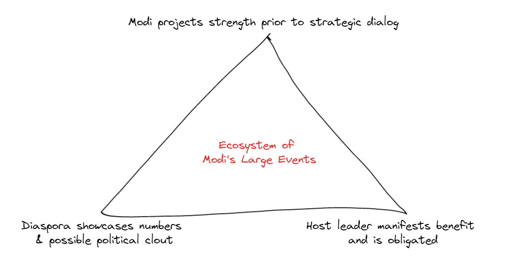 So when Modi came to the US, he needed to negotiate from a place of strength. That was garnered by having large events in the run-up to the meetings.