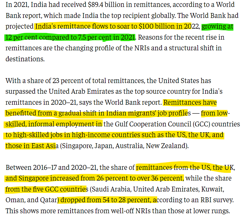 More importantly, the mix of the NRIs sending money home is changing rapidly and significantly. While the Indians living in high-income countries like the US, UK and East Asia working in high-income jobs are now contributing 36% (up from 26% in 2016) to the total remittances, the contributions from low-skilled NRIs from the Middle East have dropped from 54% to 28%!
