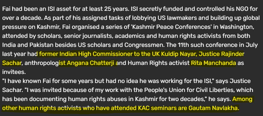 Folks like ex-Indian High Commissioner Kuldip Nayyar, ex-Justice Rajinder Sachar (of Sachar Committee on Muslims), Angana Chatterjee, Rita Manchanda and Gautam Navlakha (of Bhima Koregaon infamy) were part of Ghulam Nabi Fai's junkets