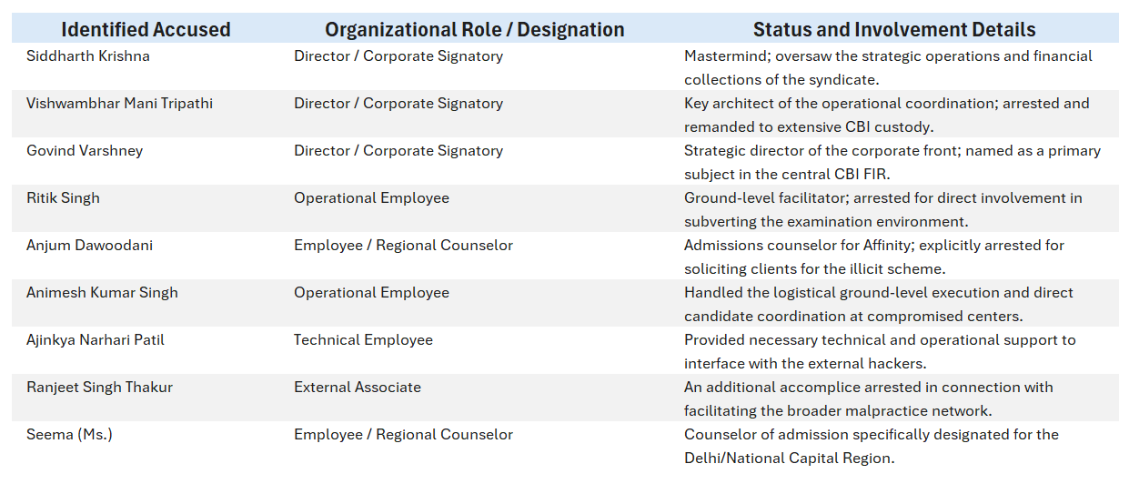 The investigation explicitly identified the three principal directors and signatories of Affinity Education Private Limited who masterminded the compromise of the examination ecosystem.