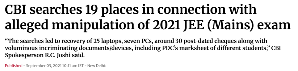 Sitting in a distant location from examination centres, a group of “solvers” hacked into computers and wrote the exam for engineering candidates, while the actual candidates scribbled on sheets, pretending to be making calculations and solving questions. This is how the fourth session of the competitive Joint Entrance Exam (JEE), meant for admission to top engineering colleges, was allegedly manipulated in the last two weeks by a Kanpur-based private company, Affinity Education Pvt. Ltd, to facilitate admissions to a few students. On 1 September, the Central Bureau of Investigation (CBI) registered a case to investigate the “irregularities” in the exam, after the agency received information on the ongoing racket and booked the company’s directors, consultants, technicians and touts in the case. Eleven people have been arrested so far. (Source: This is how JEE Mains was ‘manipulated’: ‘Solvers’ hacked into computers to write papers / The Print)
