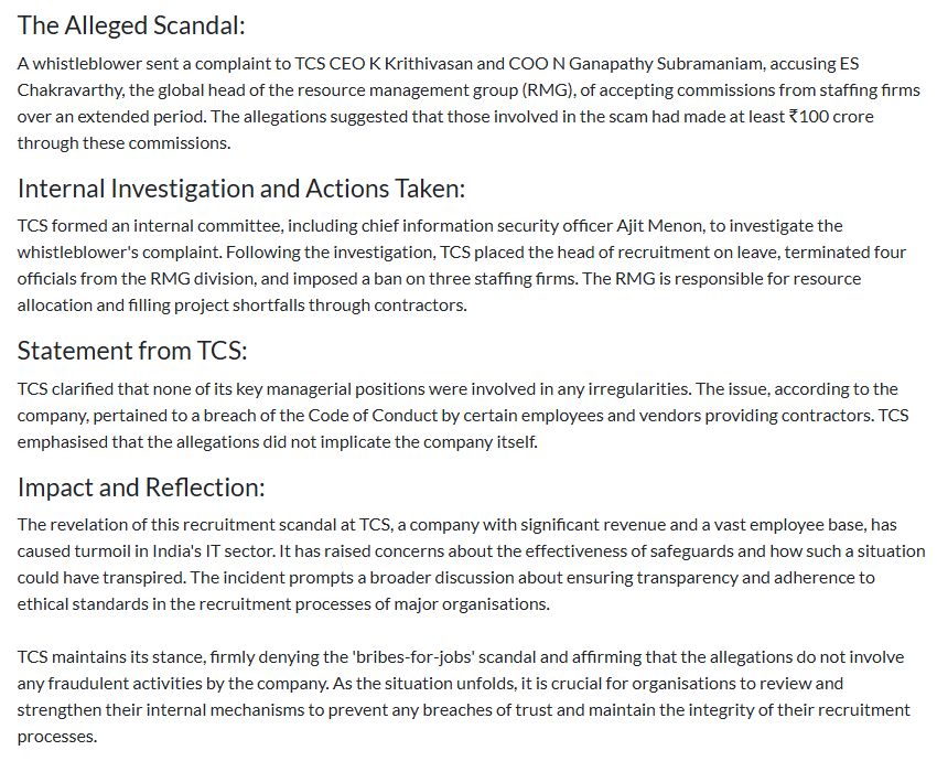 TCS recently faced a severe internal scandal that fundamentally challenged its governance models and exposed deep-seated corruption within its hiring apparatus.