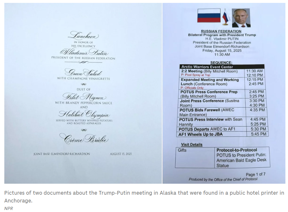Eight pages, that appear to have been produced by U.S. staff and left behind accidentally, shared precise locations and meeting times of the summit and phone numbers of U.S. government employees. (Source: Government papers found in an Alaskan hotel reveal new details of Trump-Putin summit / NPR)