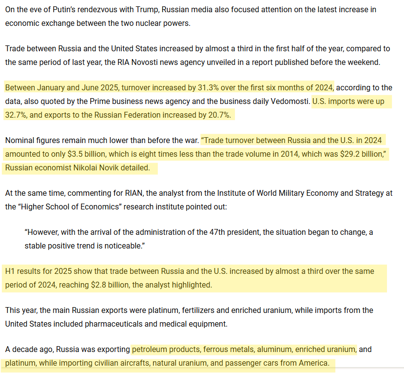 The rise in 2025, although still “symbolic” compared to the $29.2 billion peak of 2014, underscores modest but visible positive momentum. This growth has been driven by energy-related goods (such as enriched uranium), fertilizers, and precious metals from Russia, and pharmaceuticals and medical equipment from the U.S.