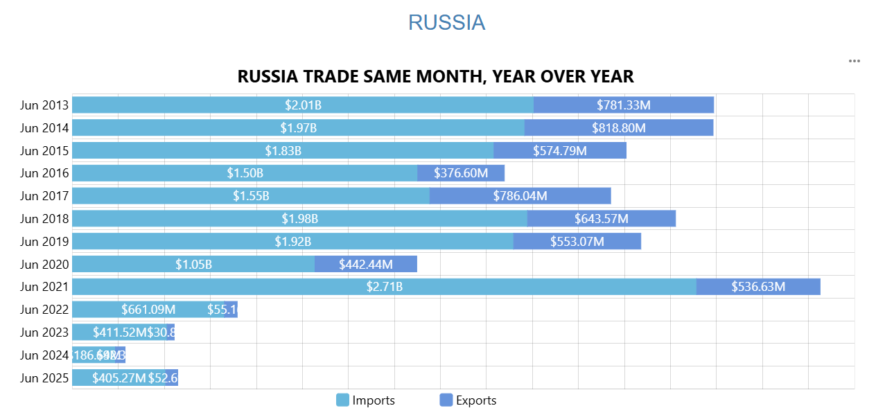 According to recent trade figures, total bilateral trade reached $2.78 billion in the first half of 2025, representing a 31% increase over the same period in 2024. Imports from Russia jumped by about 33%, while U.S. exports to Russia rose by over 21%, albeit from a relatively low base compared to pre-Ukraine-invasion years.