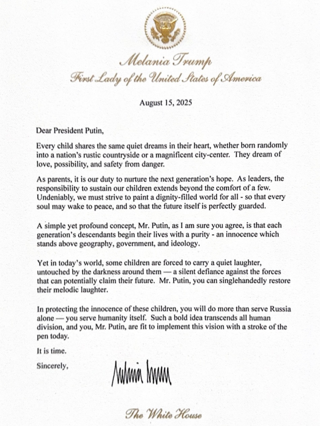 One striking moment came when President Donald Trump personally handed Vladimir Putin a letter written by First Lady Melania Trump. Framed as a gesture of warmth, it appeared oddly trivial against the backdrop of a high-stakes meeting that produced no concrete outcomes. The following day, the first lady’s office even amplified the moment by reposting a Fox News article showcasing the brief note.