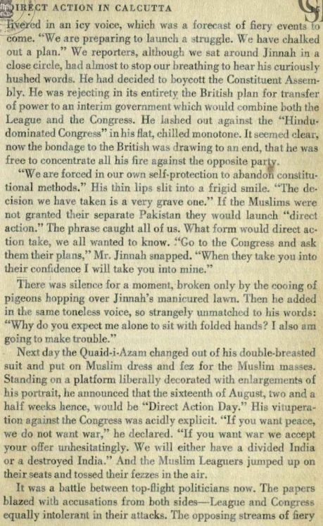 The call for Direct Action Day was very clear. It was a call for violence against the Hindus on the lines of the Battle of Badr. It was part of the advertisements and pamphlets that the Muslim League had distributed to its base and to Muslims all over India.