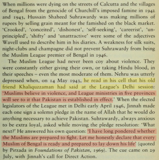 Suhrawardy, then Chief Minister of Bengal, played the part of a modern-day Yazid. He used his control over the Home and Information portfolios to disable the police, blackout news coverage, and ensure that Muslim mobs operated freely. In My People Uprooted, Tathagata Roy notes that Suhrawardy told the crowd at the Ochterlony Monument on August 16 that “the police will not interfere”—a green signal to unleash hell (Source: "Halfway to freedom: a report on the new India in the words and photographs of Margaret Bourke-White" / Bourke-White, Margaret).