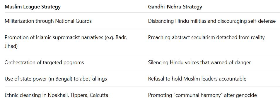 Even when it was clear that the Calcutta killings were orchestrated with state complicity and Islamic religious fervor, Nehru and Gandhi sought to suppress these facts from public discourse. Their focus shifted immediately to restoring “communal harmony”, not accountability. There was no national mourning, no government commission to investigate the Muslim League National Guards, no reparations or restitution for the victims.