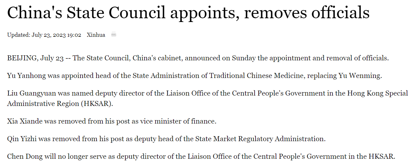 Le Yucheng was removed from the post of deputy director of the National Radio and Television Administration and Gao Peiyong was removed from the post of vice president of the Chinese Academy of Social Sciences, while Lyu Erxue was relieved of his position as deputy director of the Civil Aviation Administration of China. (Source: State Council appoints, removes officials / State Council of PRC)