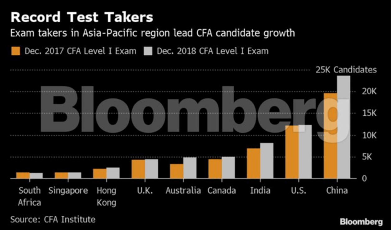 Over the past 4-5 years specifically, the numbers of Chinese students taking the CFA tests have suddenly shot up.  They are twice that of those in the US.  India being a distant third.