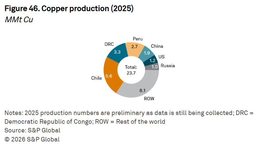 Major copper reserves are concentrated in Chile, Peru, the Democratic Republic of Congo, and China.