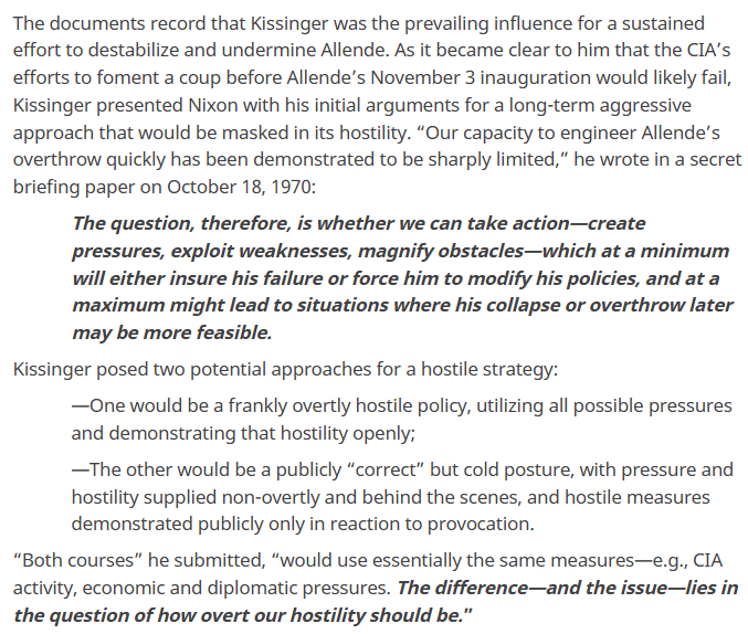 The hatred for Salvador Allende, a leader who wanted to stand Chile on its own terms, was evident in White House circles. The question was never whether to subvert Chile! But how overt should it be?