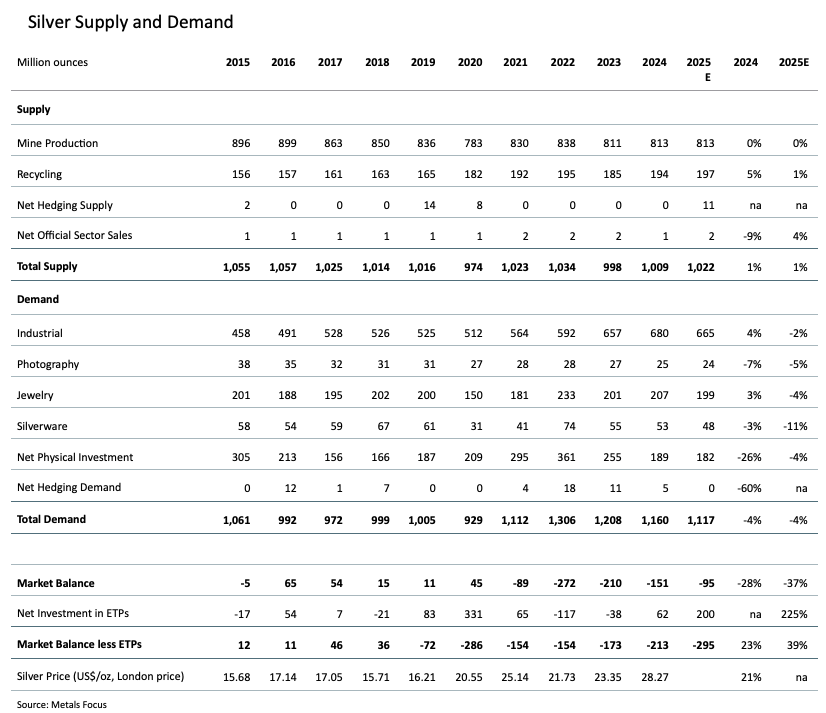 This has been a dramatic year for the silver market, with record metal prices, an unprecedented liquidity squeeze resulting in record-high lease rates, record volumes being delivered into CME vaults as a reflection of tariff concerns in the US, and silver being officially designated as a critical mineral by the US government. These developments coincide with elevated macroeconomic and geopolitical risks, including US trade policy, prompting investors to lift allocations to precious metals for portfolio diversification. As a result, investment demand has strengthened noticeably, comfortably offsetting the weakness across all key areas of silver demand. Against this backdrop, the silver price hit a record high and posted a 67% year-to-date gain to November 6. This eclipses the 52% rise for gold and the 14% increase for the S&P 500. In terms of market fundamentals, global supply is estimated to rise by 1%, underpinned by a modest return to producer hedging. Global demand is expected to decline by 4%, with all significant demand categories posting lower totals. Even so, the market has remained in deficit in 2025, marking the fifth consecutive year. (Source: The Silver Market is on Course for Fifth Successive Structural Market Deficit / The Silver Institute)