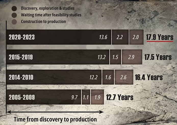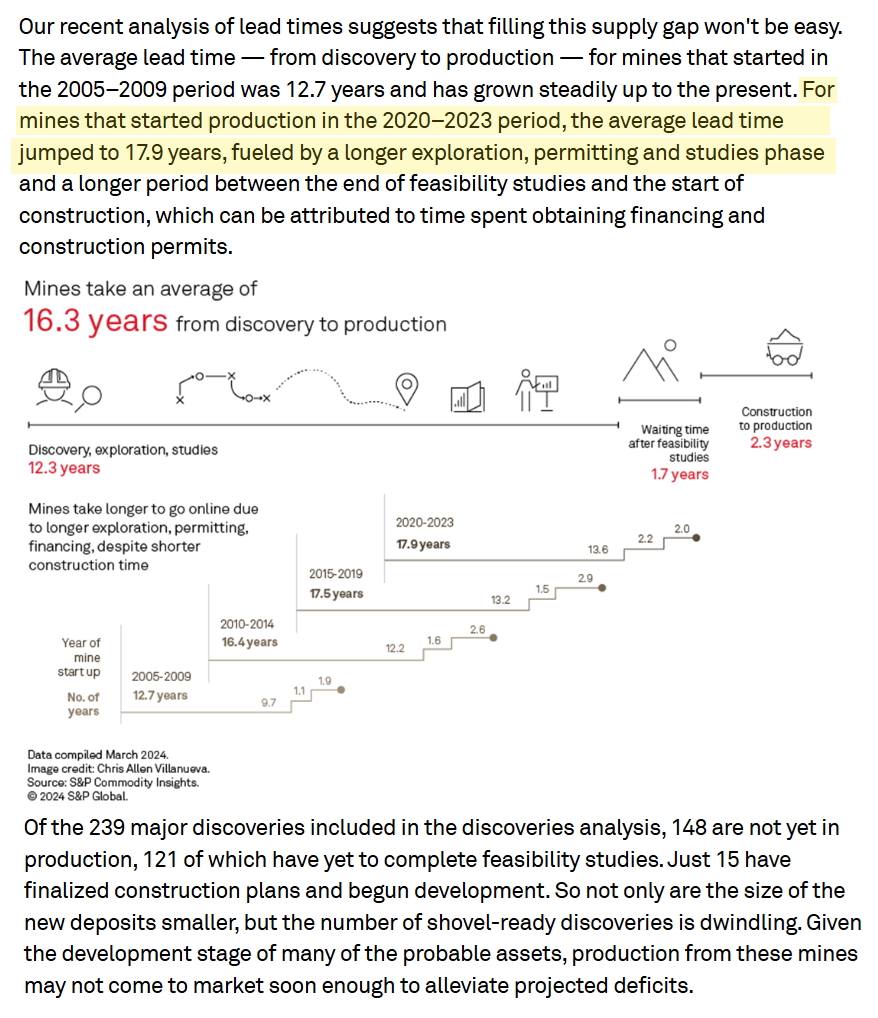 Copper production faces a brutal arithmetic: demand growth outpaces supply expansion by design, not accident. Bringing a greenfield copper mine from discovery to first production these days requires, on average, ~ 18 years.