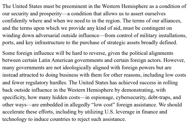 The U.S. foreign policy framework — as articulated in its national security strategy — emphasizes reducing dependence on China for critical resources and keeping Latin America within Washington’s strategic orbit.