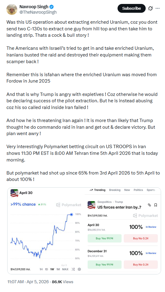 The rescue has immediate implications for the next 48 hours. With the missing colonel recovered, the political pressure on Trump to show restraint has been removed. The rescue is a domestic victory — it validates his decision to go to war and gives him the confidence to execute on the "Power Plant Day" threat without looking reckless. India's strategic window for de-escalation has narrowed significantly. Before the rescue, there was an argument that bombing power plants while an American was behind enemy lines would be unconscionable. That argument is gone. India's most urgent diplomatic task — engaging both Tehran and Washington before April 7's 8pm deadline — must now be framed not around humanitarianism but around economic consequences: every escalation costs India an additional $2 billion per week in current account deterioration.