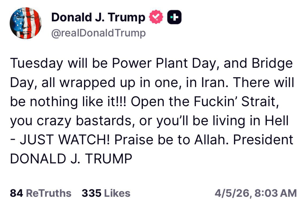 "Tuesday will be Power Plant Day, and Bridge Day, all wrapped up in one, in Iran. There will be nothing like it!!! Open the Fuckin' Strait, you crazy bastards, or you'll be living in Hell - JUST WATCH! Praise be to Allah." — President Donald J. Trump, Truth Social, Easter Sunday, April 5, 2026
