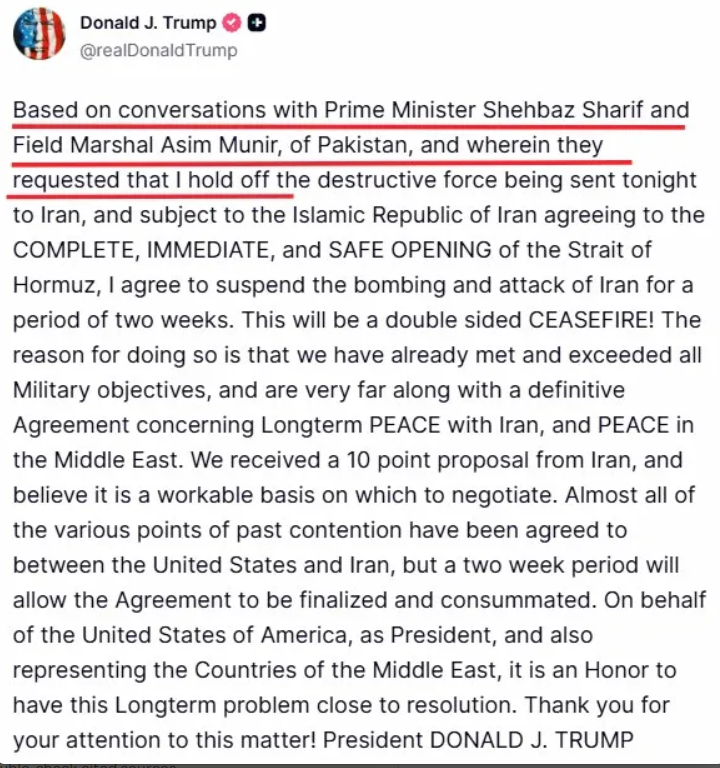 At approximately 6:15 pm EST on Tuesday, April 7, 2026 — roughly 105 minutes before Trump's own 8 pm deadline — Trump posted on Truth Social, announcing a "double-sided CEASEFIRE." The post read: "Based on conversations with Prime Minister Shehbaz Sharif and Field Marshal Asim Munir, of Pakistan, and wherein they requested that I hold off the destructive force being sent tonight to Iran, and subject to the Islamic Republic of Iran agreeing to the COMPLETE, IMMEDIATE, and SAFE OPENING of the Strait of Hormuz, I agree to suspend the bombing and attack of Iran for a period of two weeks."