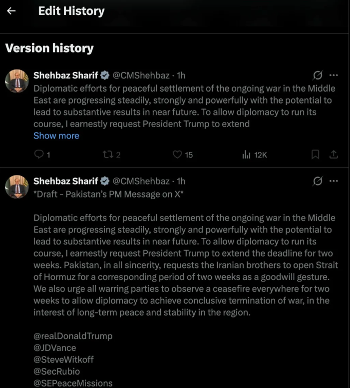 Shehbaz Sharif's April 7 post on X — the post that Trump credited as the basis for suspending military operations against Iran — went through two public versions. Version 1, the draft, began: "Draft - Pakistan's PM Message on X." Version 2, the published version, deleted that header. The substantive text was identical across both versions.