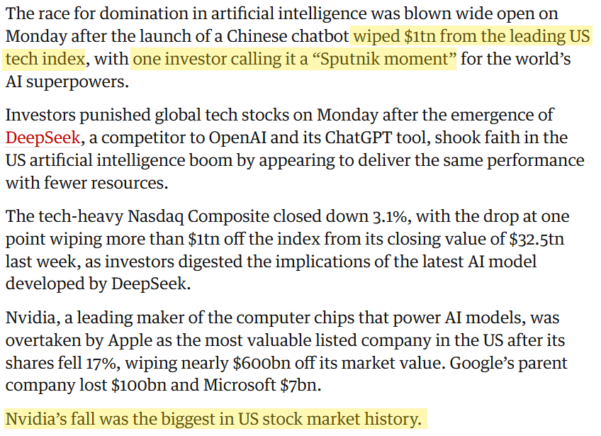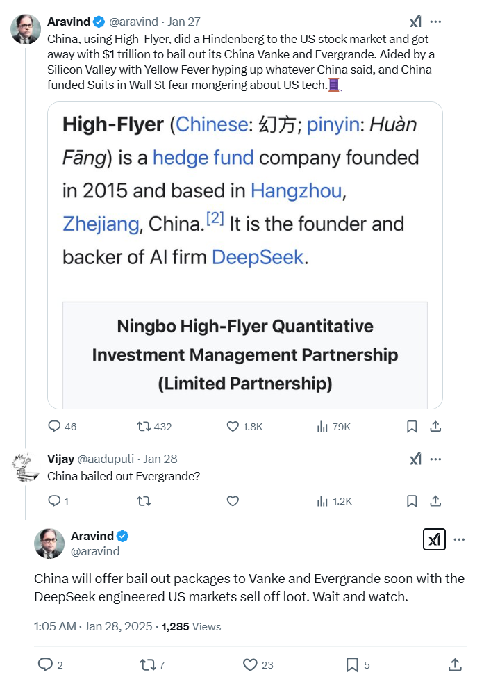 The X handle said something very interesting - DeepSeek did a "Hindenberg" on the US market with AI. And further, this stock market crash would have generated enough money for the Chinese to bailout their failing real estate giants like Vanke and Evergrande.