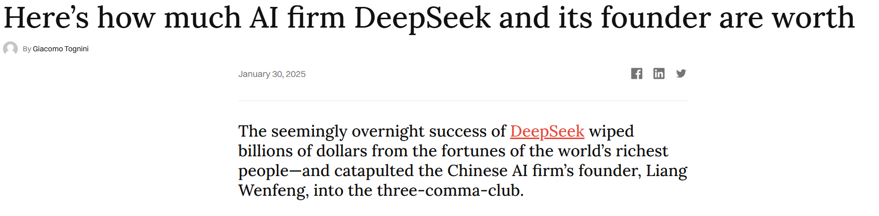 Remember that Chinese Hedge Fund High Flyer (founded in 2015 and based out of Hangzhou, Zhejiang) had the same founder - Liang Wenfeng - as the founder and backer of AI firm DeepSeek. The unexpected ascent of Chinese AI firm DeepSeek has swiftly vaulted its founder, Liang Wenfeng, into the billionaire elite.