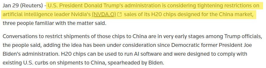 One unanswered question is how DeepSeek achieved such an impressive performance from its AI model without using Nvidia’s top-of-the-line H100 chips. The U.S.-made chips are export-restricted. Alexandr Wang, the CEO of Scale AI, has a theory: “My understanding is that DeepSeek has about 50,000 H100s which they can’t talk about, obviously, because it is against the export controls that the United States has put in place.” (Source: "‘Is DeepSeek a DeepFake or real?’ Doubts and questions emerge on Wall Street and in Silicon Valley" / Fortune)