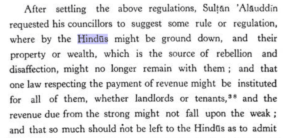 The paramount concern of Alauddin Khilji during his reign was on how to “HIndus might be ground down and their property or wealth ……might no longer remain with them” (from “The Reign of Alauddin Khilji – Translated from Zia-ud-din Barani’s Tarikh-i-Firuz Shahi”)