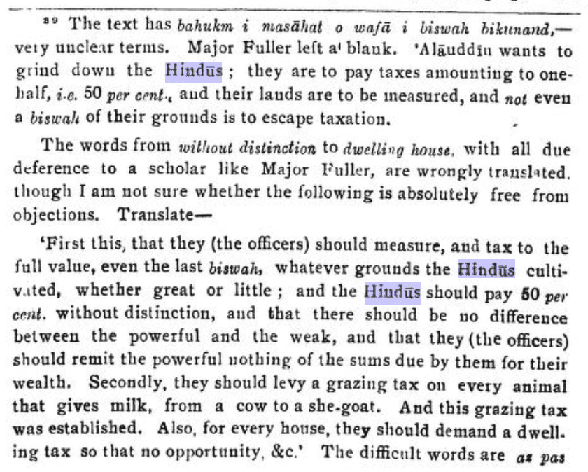 One, by levying debilitating 50% tax on the produce by Hindus based on the total land possessed by them – cultivable or not. Irrespective of the land holding. Full value of the produce per biswah was taken as the basis of the calculation. Second, Grazing tax on every animal that gives milk from a cow to a she-goat.