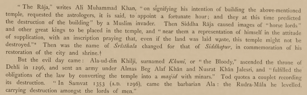 As Burgess explains, Khilji’s army not just destroyed and plundered the temple in Siddhpur, but also built a mosque over it. Burgess later discusses the glory of that magnificent temple, even in its destroyed state!